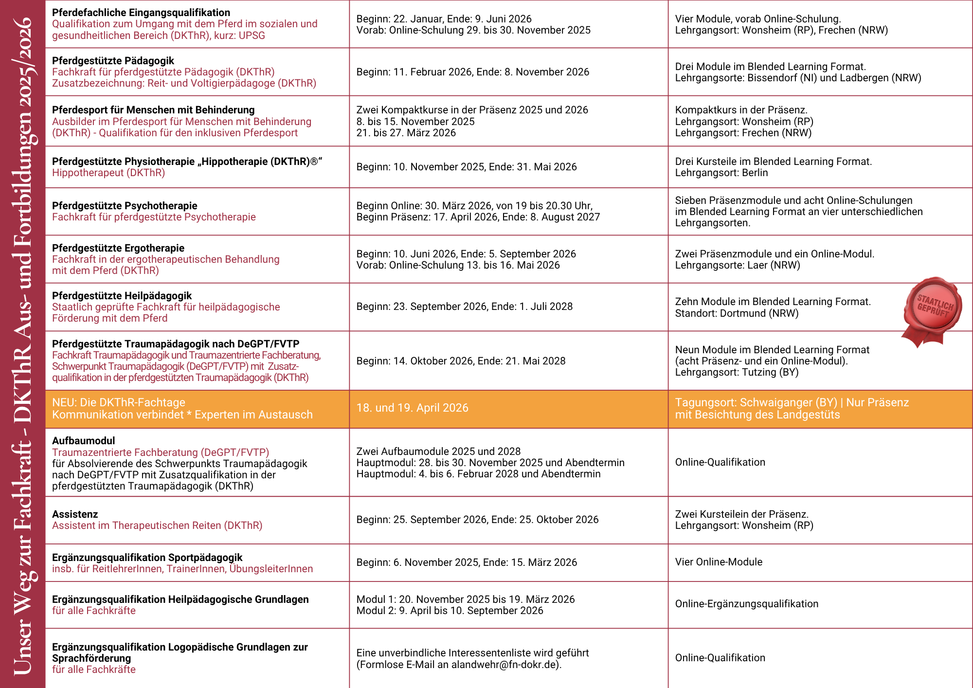 Das Deutsche Kuratorium für Therapeutisches Reiten (DKThR) ist seit über 50 Jahren der Bundesfachverband für pferdgestützte Therapie, Förderung und den Pferdesport für Menschen mit Behinderung.